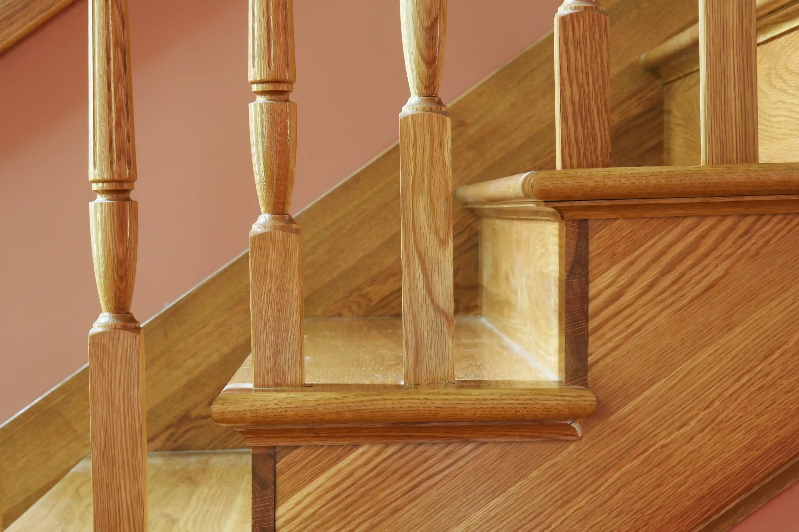 All treads are solid oak or maple. We install oak or maple veneer on risers and stringers.